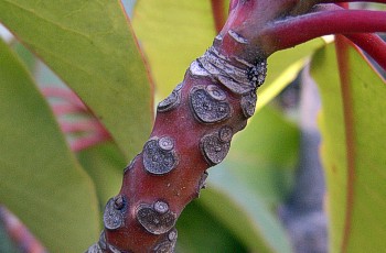 葉痕は三角形または半円形。 維管束痕は3個。 |