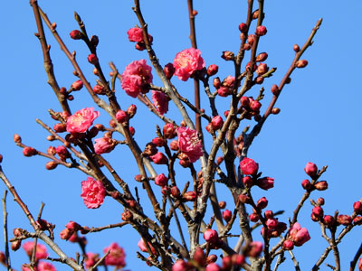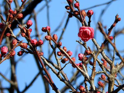 1/22 中央公園では白梅(小梅)、寒紅梅(一重)、紅千鳥などが咲き出していました。