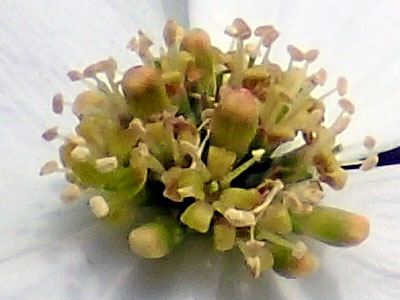 白く花弁のように見えるのは総苞片、 その中心に黄緑色の小さな花が15〜20個集まって球形の頭状花序をつけている。花弁は4個、おしべ4個。 |