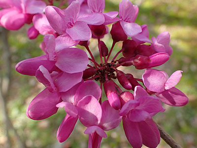 葉が展開するまえに前年枝や古い枝に 紅紫色の花を束生する。 |