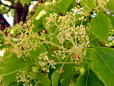 新葉のわきから円錐花序を出して、小さい淡黄色の花をまばらにつける。 花被は筒型で上部で6裂する。 |