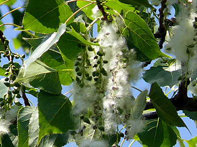 5/29 中央公園 内の大木になったポプラの果実がぶら下がっているのが見えました。果実が裂けて綿毛をだし、また落果した綿毛も見られました。