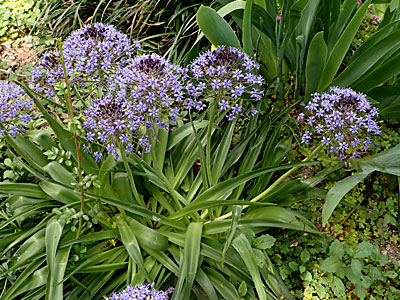 5/8 中央公園のすぐ近くの若葉町団地の庭で大きなネギの花?と思われる紫色のオオツルボの花を見ました。