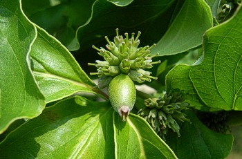 雄花だけの花序と 両性花(若い果実)が混ざっている |