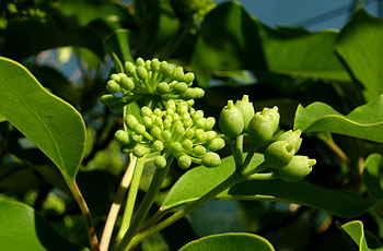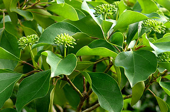 雌雄同株 枝先に球形の散形花序を1〜3を出し、花柄は長さ4〜7cm。 淡黄緑色の小さい花を多数つける。花弁5個、雄しべ5個。 |