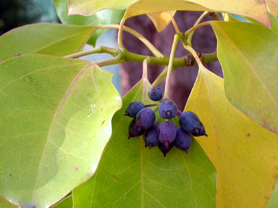 果実は液果。長さ葯cmの広楕円形。 11〜12月に紫黒色に熟し先端に花柱が残る。 |