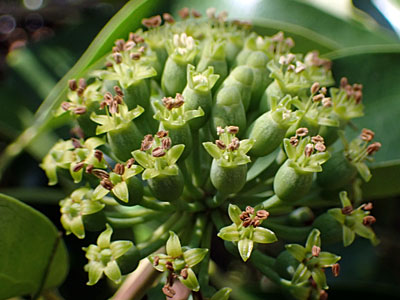 雌雄同株 枝先に散形花序を1〜3を出し、 淡黄緑色の小さい花を多数つける |