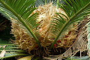 10/30 大きなソテツの葉の中、雌株では褐色の大胞子葉が束生しています。
