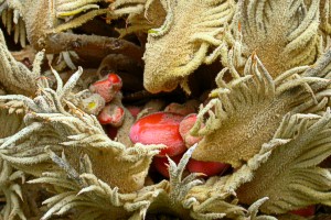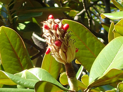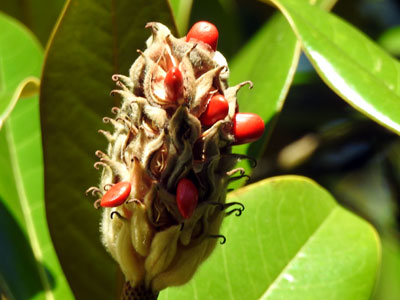 10/13 園内のタイザンボクの果実が裂けて赤い種子が覗いていました。