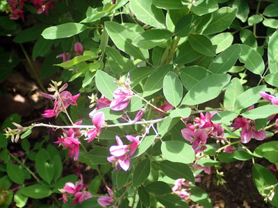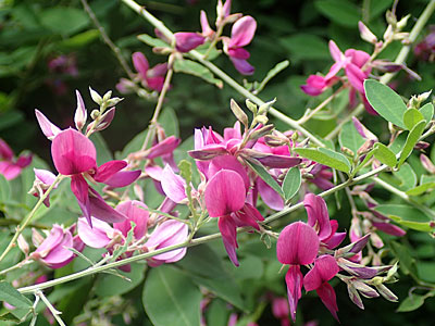 小葉は長さ2〜6cmの長楕円形で先が尖る。 花は紫紅色で長さ約1.5cm。 |