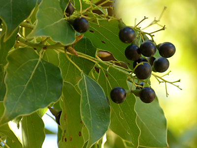 果実は核果、長さ7〜9mmの楕円形〜卵形。 完全に熟すと黒くなる。 |