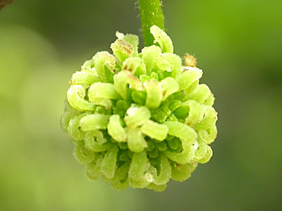 モミジバフウは雌雄同株 葉の展開と同時に雄花、雌花はそれぞれ別の頭状花序を作る 長い柄の先にぶら下っているのは雌花序、総状に付いているのが雄花序 |