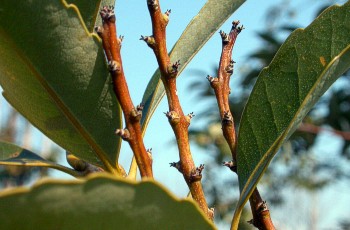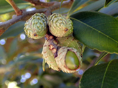 雄花(つぼみ)と 12ヶ月ほど経た殻斗(若い果実)が同時に見える。 |