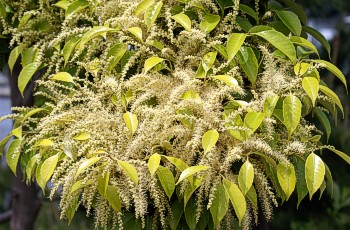 雌雄同株。黄色い雄花が咲きだして、スダジイの存在が遠くからでもよく分かる。 虫媒花なので周囲に強力な香りを発散させている。 |