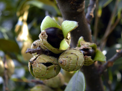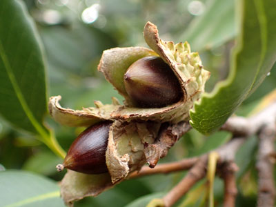 成熟してきたスダシイの殻斗は3方向に裂けてドングリが顔を出す。 |