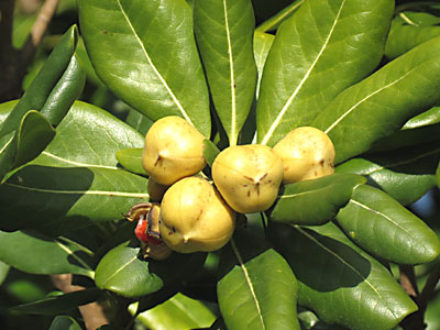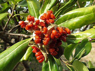 | 果実は刮ハ。3裂して粘った赤い種子を8〜12個出す。 | |