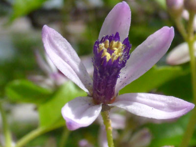 花弁は5個。雄しべは10個。 紫色の花糸が合着して雄しべ筒となっている。 その内側に黄色の葯が見えている。 |