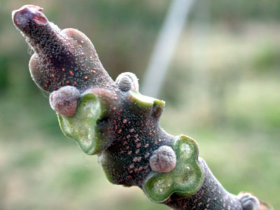冬芽と葉痕 冬芽は平たい球形。 葉痕はT字形。維管束は3個。 |