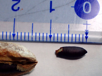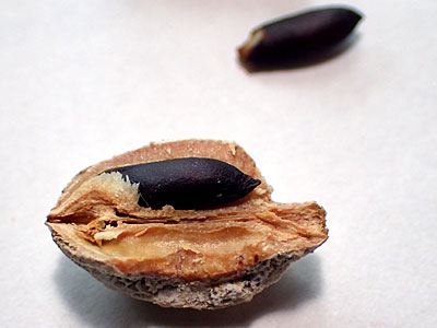 | 果実は核果。核の長さは1.5〜2cm。縦に深い溝がある。核の中に種子がある。 | |