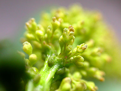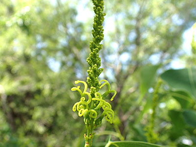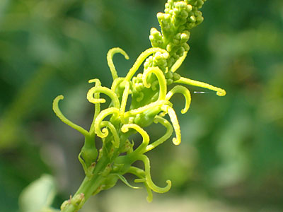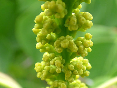 | 花序の上部には多数の雄花 2014/6/22 | 花序の下部には雌花(柱頭が3裂) |