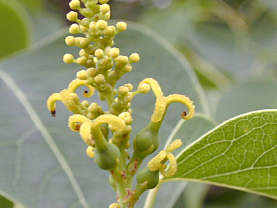 花柄の基部に卵形の苞があり、苞の左右に大きな腺体がつく 写真左 雄花の基部 右写真 雌花の基部 |
