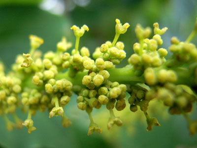 7月ごろ枝先に黄色の小さな花を多数つけています。7月下旬には果実が出来始めています。