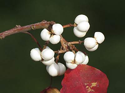 秋には褐色の果実が裂開して、3個の種子を出しています。種子は白いロウ質の仮種皮に包まれています。