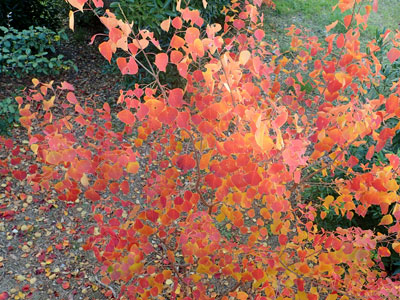 紅葉が始まったナンキンハゼ、果実は木により それぞれ 緑色の若い果実、成熟した黒褐色の果実、それが割れて白い仮種子が見えたものなど。 |