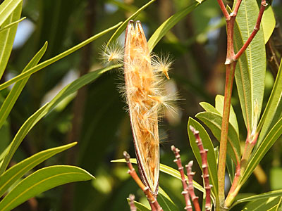 キョウチクトウの果実は袋果 熟すと縦に裂けて種子を出す。 |