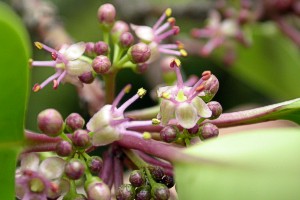 紫色を帯びる本年枝の葉腋に散形花序を出し 白色または淡紫色の花を2〜7個つける。 |