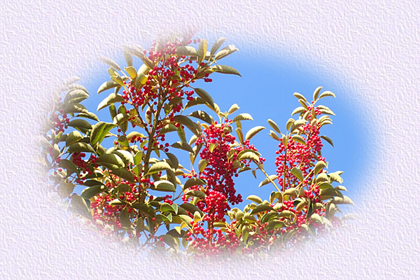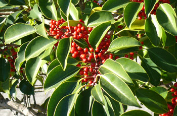 果実は核果、球形で長さ6mmほど。 11〜12月頃、赤く熟す。 |