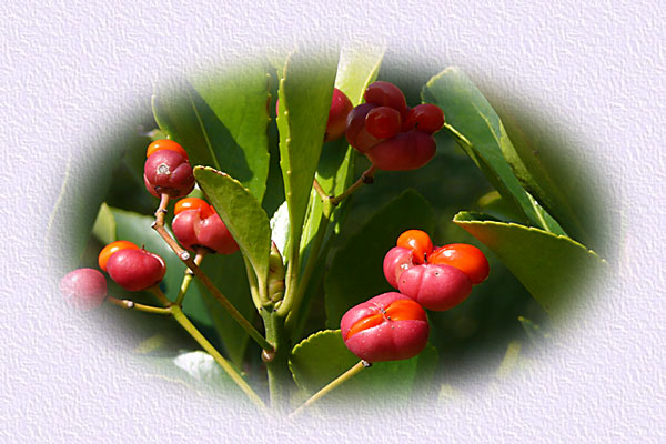 果実は刮ハで直径6〜8mmの球形、晩秋〜初冬にかけて紅色に熟し、4裂する。 種子は橙赤色の仮種皮に包まれて、落ちずにぶら下る。 |