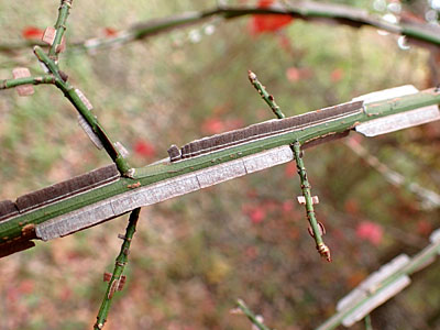 若い枝は緑色で、4稜があり、稜上に褐色の薄い板状の翼がある。 その翼は稜上に互い違いについている。 |