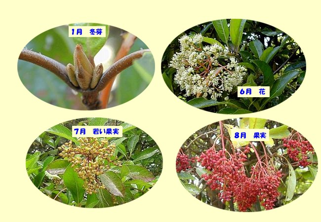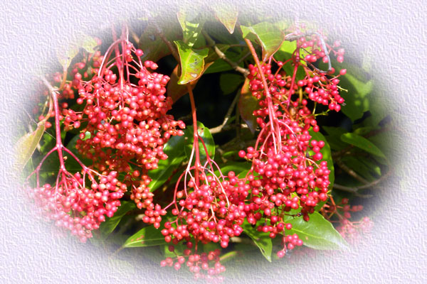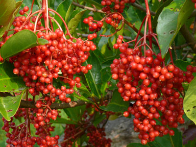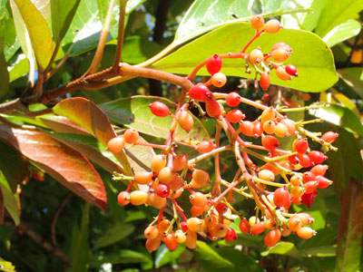 果実は核果。長さ7〜9mmの楕円形〜卵形。 果実も果序枝も赤く染まって まさにサンゴの様! |