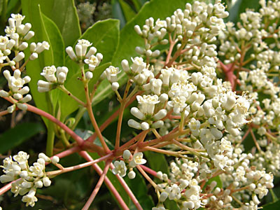 枝先に円錐花序を出し、直径6〜8mmの白色の花を多数つけ、花冠の上部は5裂する |