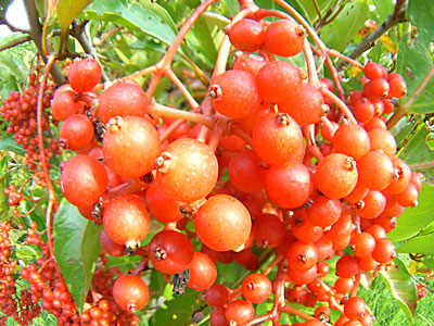 中央公園や西浜公園などに植えられているサンゴジュです。6月ごろに枝先に円錐花序を出して、白い小花を多数つけています。7月はじめごろには若い果実が出来始め、8月半ばごろには、赤い成熟した果実が出来ます。果序の枝も真っ赤になっています。