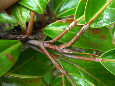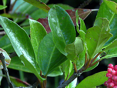 葉は対生。葉身は長さ7〜20cm、幅は4〜8cmの楕円形〜長楕円形。 ふちは全縁。葉は革質で表面は光沢がある。 |