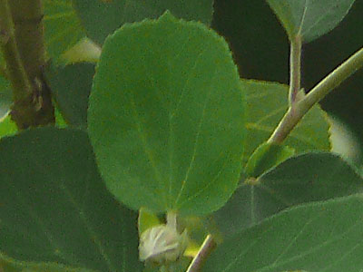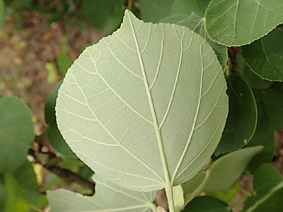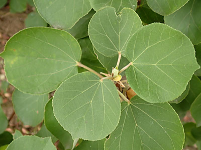 葉は互生。葉は円形または広卵形。先は短く尖り、基部は円形またはハート形。 |