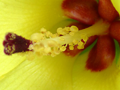 花柱の下半分は雄しべ筒に包まれて 上部は突き出て5裂する。 花糸が合着したクリーム色の雄しべ筒に葯が付く。 |