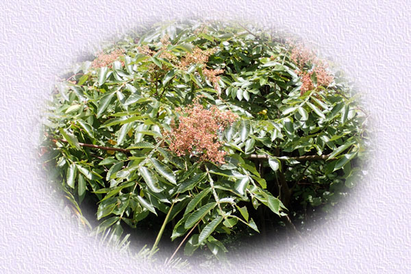 葉は長さ30〜60pの奇数羽状複葉で 葉軸に翼があるのが特徴。 |