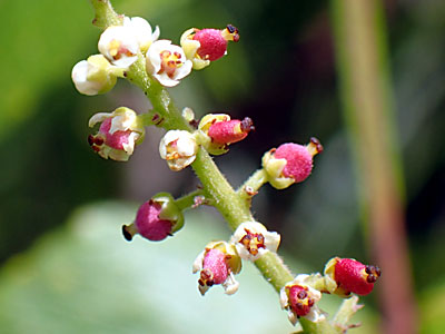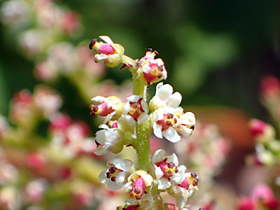 白色の小さい花を円錐状に多数つける。 こちらは雄花。雄しべ5本あり、花弁は反り返る。 |