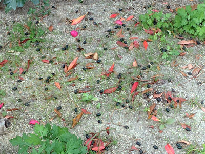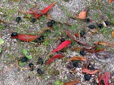 親水中央公園にはホルトノキが多く植えられていて、それぞれの木の下では たくさん落果した黒い果実が見られました。 |