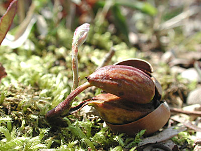 ドングリが地上に落下後、すぐに発根、発芽し、冬を越し 春になると地上部分が立ち上がる。 |