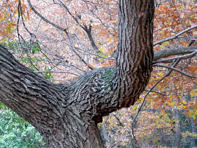 コナラの樹皮は灰黒色。縦に不規則な裂け目がある。 |