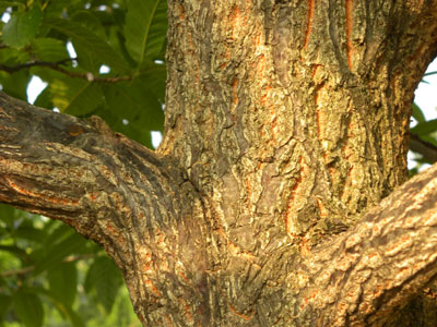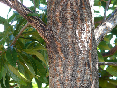 | 樹皮は灰褐色で厚く、不規則に深く割れる。 | |
