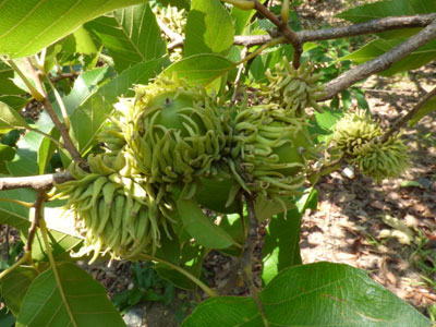 昨年の春に受粉して1年半ほど経たどんぐり。 殻斗(おわん)に線形の鱗片がビッシリと付く。 ドングリは直径2〜2.5cmの球形。 |