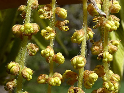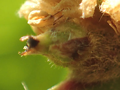 雄花序には軟毛が多い。 雄花が開きかけている。 雄しべは3〜6個。 |