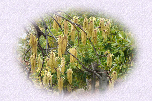 雄花序は長さ約10cm、 葉が開ききる前に新枝の下部から 垂れ下がる。 |