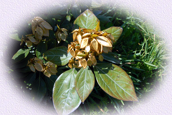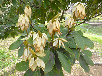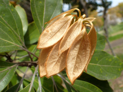 葉は互生、枝先に集まって付く。全縁で3脈が目立つ。 若葉は垂れ下がり黄褐色の絹毛に覆われる。 |