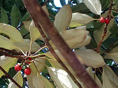 果実は液果。長さ1.2〜1.5cmの楕円形。 葉裏はロウ質に覆われて灰白色。 |
